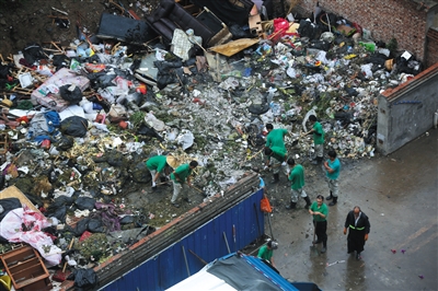 同樣,在朝陽區北工大附近某小區的一處垃圾處理中轉站,環衛工人騎著環衛車從四面八方趕來后,將車內五顏六色的垃圾袋一股腦兒倒進垃圾壓縮機內。破亂的垃圾袋撒出廚余垃圾等。這些被壓縮后的混合垃圾將在傍晚由環衛車統一拉送至垃圾處理廠進行處理。