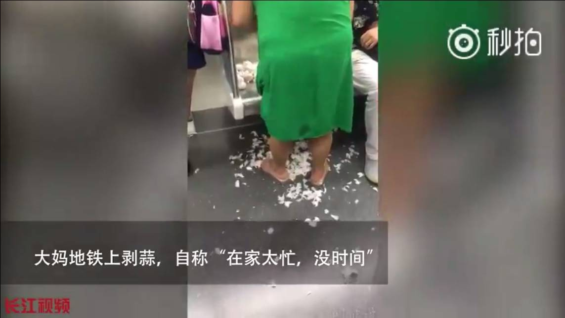 此前,武漢一位綠衣阿姨在地鐵三號線上剝蒜,白花花的蒜皮滿地都是。
