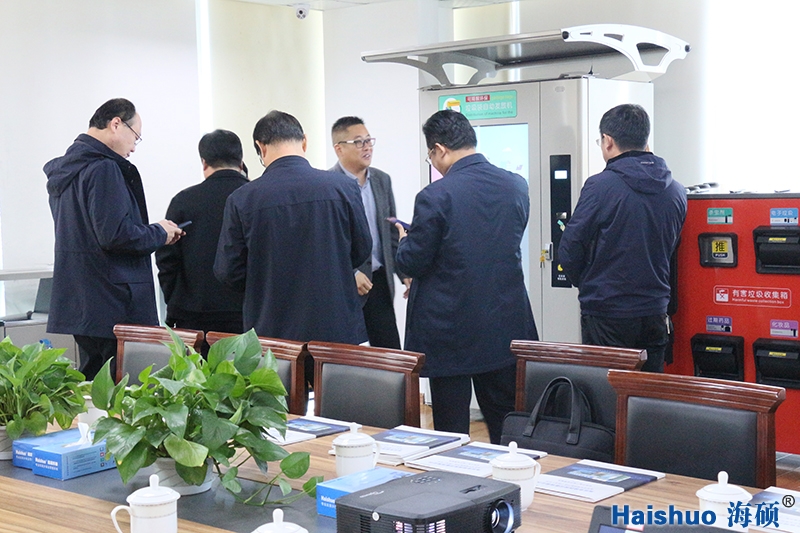 各位領(lǐng)導(dǎo)首先參觀了海碩環(huán)保垃圾分類展廳,了解了海碩環(huán)保目前主要的垃圾分類產(chǎn)品。同時(shí),工作人員詳細(xì)介紹了智能垃圾分類設(shè)備的各項(xiàng)功能和使用方法,并現(xiàn)場(chǎng)進(jìn)行了操作演示。