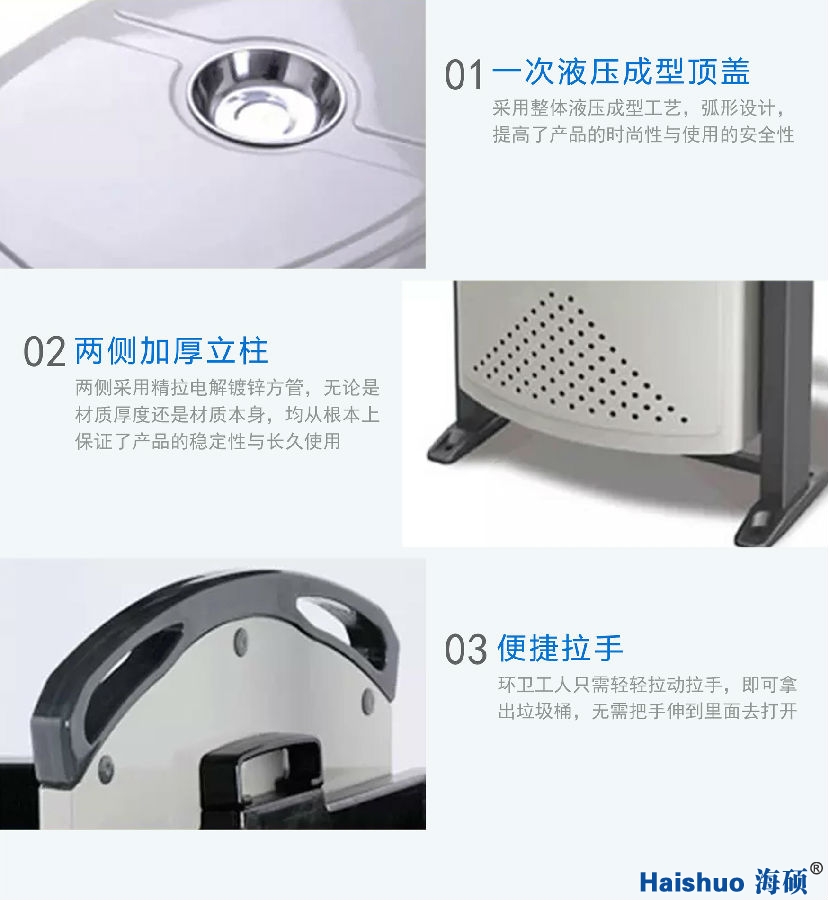 戶外分類垃圾桶款式雖是多種多樣的,但在青島街道上最常見的戶外分類垃圾桶是銀色鍍鋅板沖孔式垃圾桶,與我公司生產的電解鍍鋅垃圾桶HS-01小款,HS-02大款相同,而這兩款戶外分類垃圾桶也正是我公司最暢銷的兩款垃圾桶。